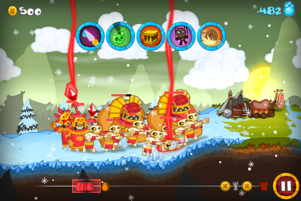 Each stage is composed of multiple levels of varying objectives: destroy the enemy base, defend your base, or collect a certain amount of resources from the environment. In order to achieve these goals, your aim is to optimise your expense of resources between gold collectors and attack units, and moderate your use of the steadily-acquired mana resource for the purpose of casting spells.