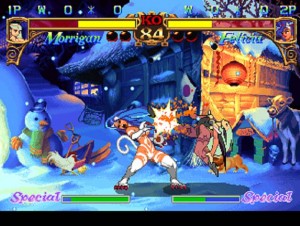 The first game in the series introduces the very dark, mythical cast of ten fighters, from a typical Vampire in Demitri, to Sasquatch, who is a, er, Sasquatch, a Frankenstein-type in Victor, and so on. Essentially the game is Street Fighter with a different set of characters and backdrop. Special moves are performed with similar motions to anyone’s Street Fighter favourites, with a few differences of course.
