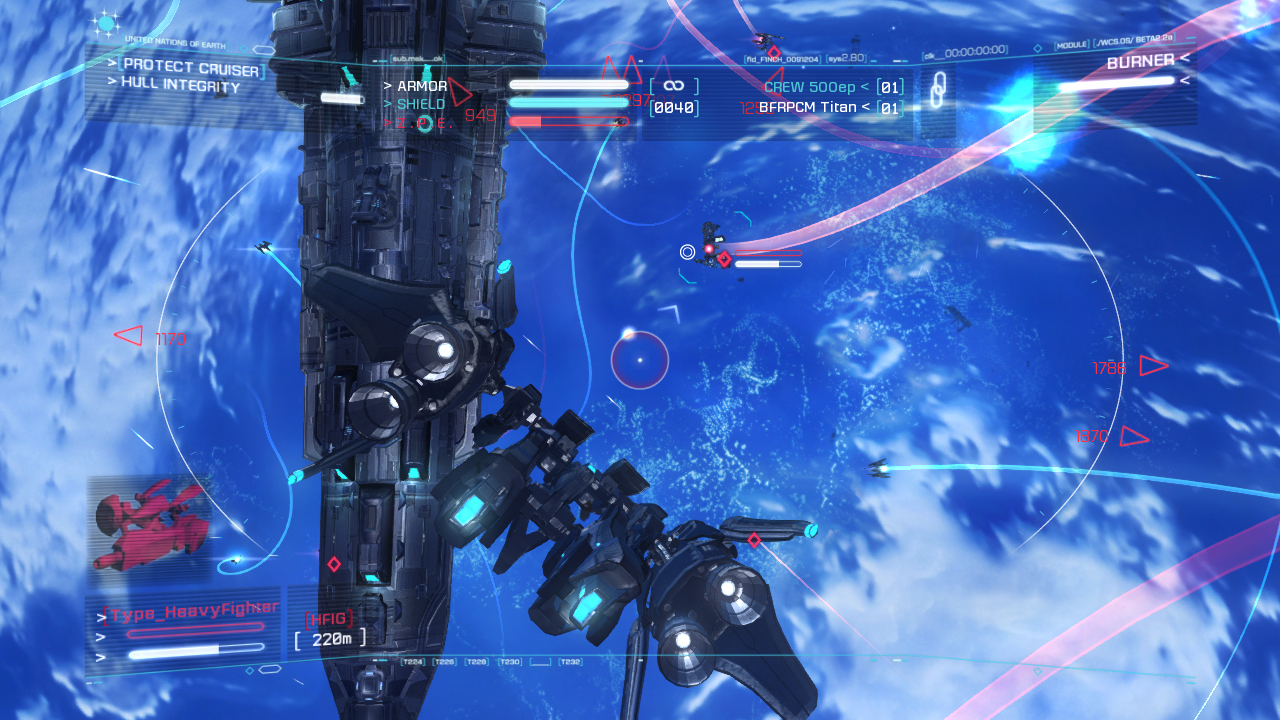 The robot form is limited by an energy bar and allows you to strafe away from incoming missiles. It also comes with a target-painting ability that fires a dozen missiles to multiple targets in one shot. All the action takes place in the suit, so sadly, there’s no equivalent to the Tiger’s Claw and her crew. Plenty of story is told through your co-pilots as you battle on the knife-edge of a galaxywide war, though you won’t see any branching storylines. The team did consider this but with only 13 levels, there’s not a lot of room for branching.