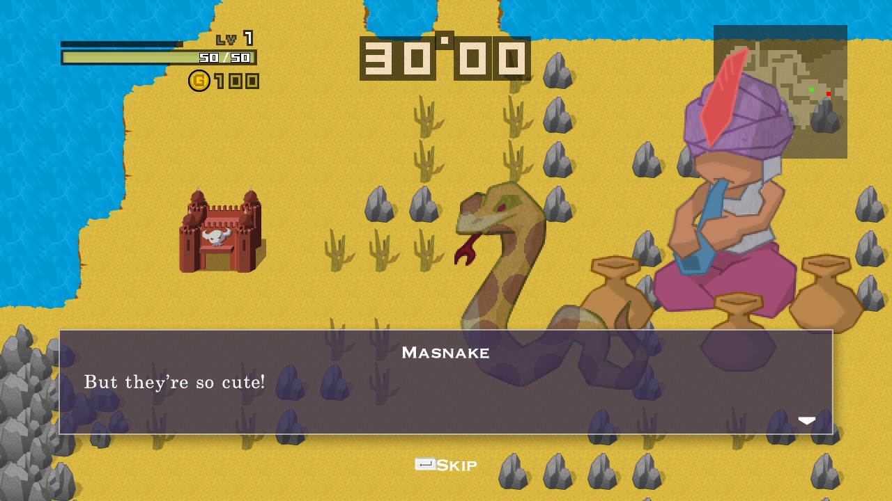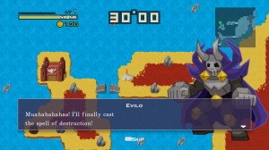 You’ll traverse the blockily-rendered kingdom by successfully conquering the evil lord for each stage and reaping the spoils. With the somewhat mercenary help of the Time Goddess and her gold-sucking shrines, it’s possible to rewind to the start of your allotted thirty seconds, though it’s wise to make sure you have the coinage to pay for the miracle. That fee will increase each time you reset the clock.