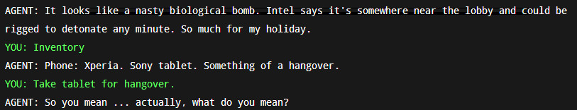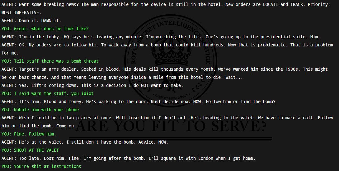 Instead, I’ve been playing a “natural language text adventure” that sets you up as an MI6 applicant guiding a field agent through a problematic mission.