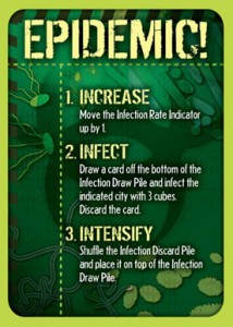 There are a few other ways to lose a game of Pandemic. Firstly there are a number of Epidemic cards mixed in with the players draw deck depending on the difficulty. Whenever one of these is drawn, the bottom card of the infection deck is revealed and the named city gets three blocks placed on it. After any already-drawn infection cards are shuffled and placed back on top of the infection deck, the infection rate is increased, meaning more infection cards are drawn each turn in future. When the last block of any coloured disease is placed, the game ends in a loss and if the players’ draw deck runs out the game also ends at a loss. There is only one real way to win a game of Pandemic; cure all four diseases by collecting the right coloured cards and trading them in for a cure.