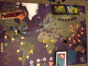 Pandemic is a co-operative boardgame for 2-4 players and takes up to an hour to play. The Pandemic board is gorgeous. While a few pickier gamers may have issue with placement of some cities, for the most part it’s pretty accurate. The cards are thick and of high quality and the disease blocks are well… blocky.