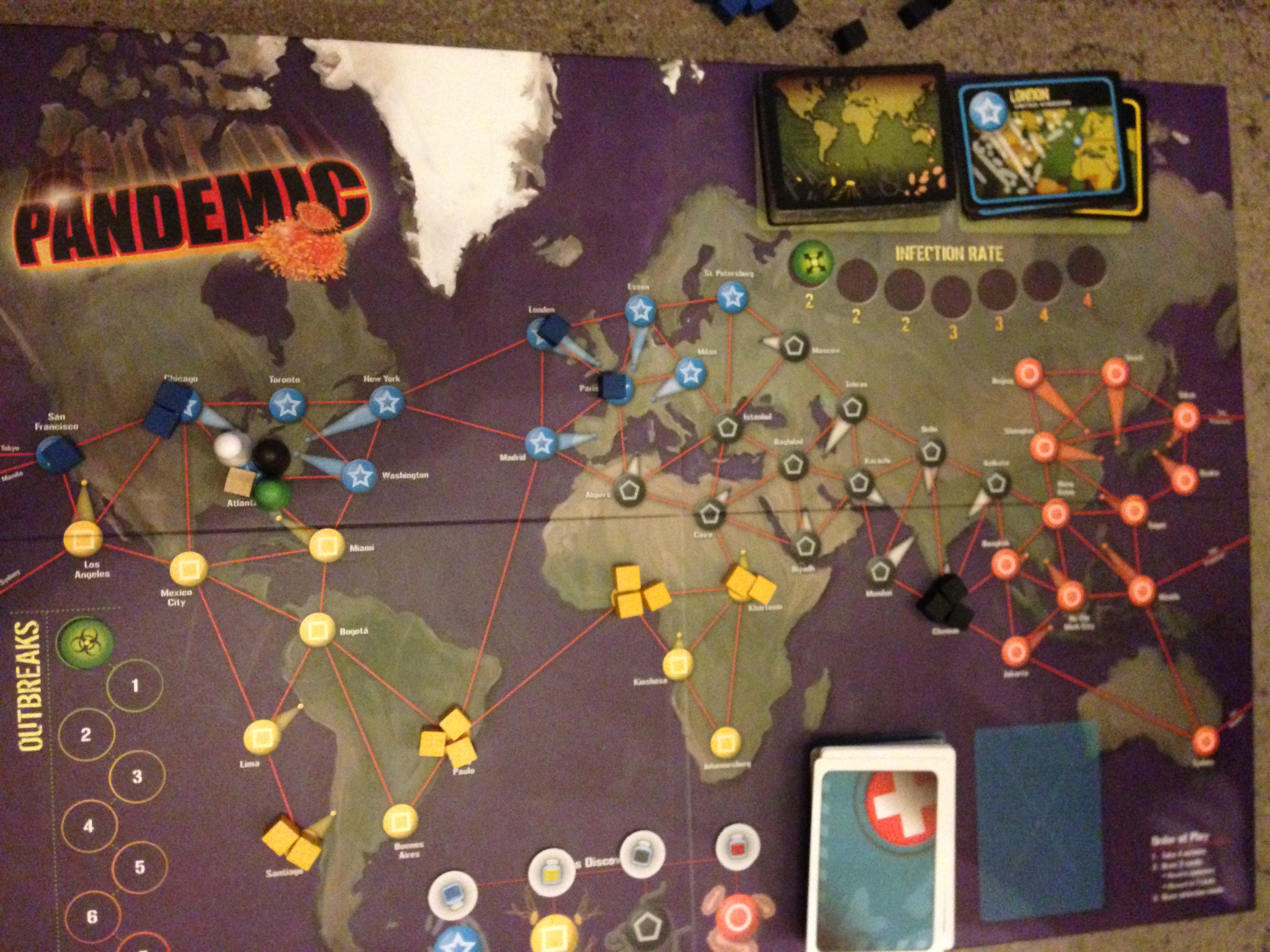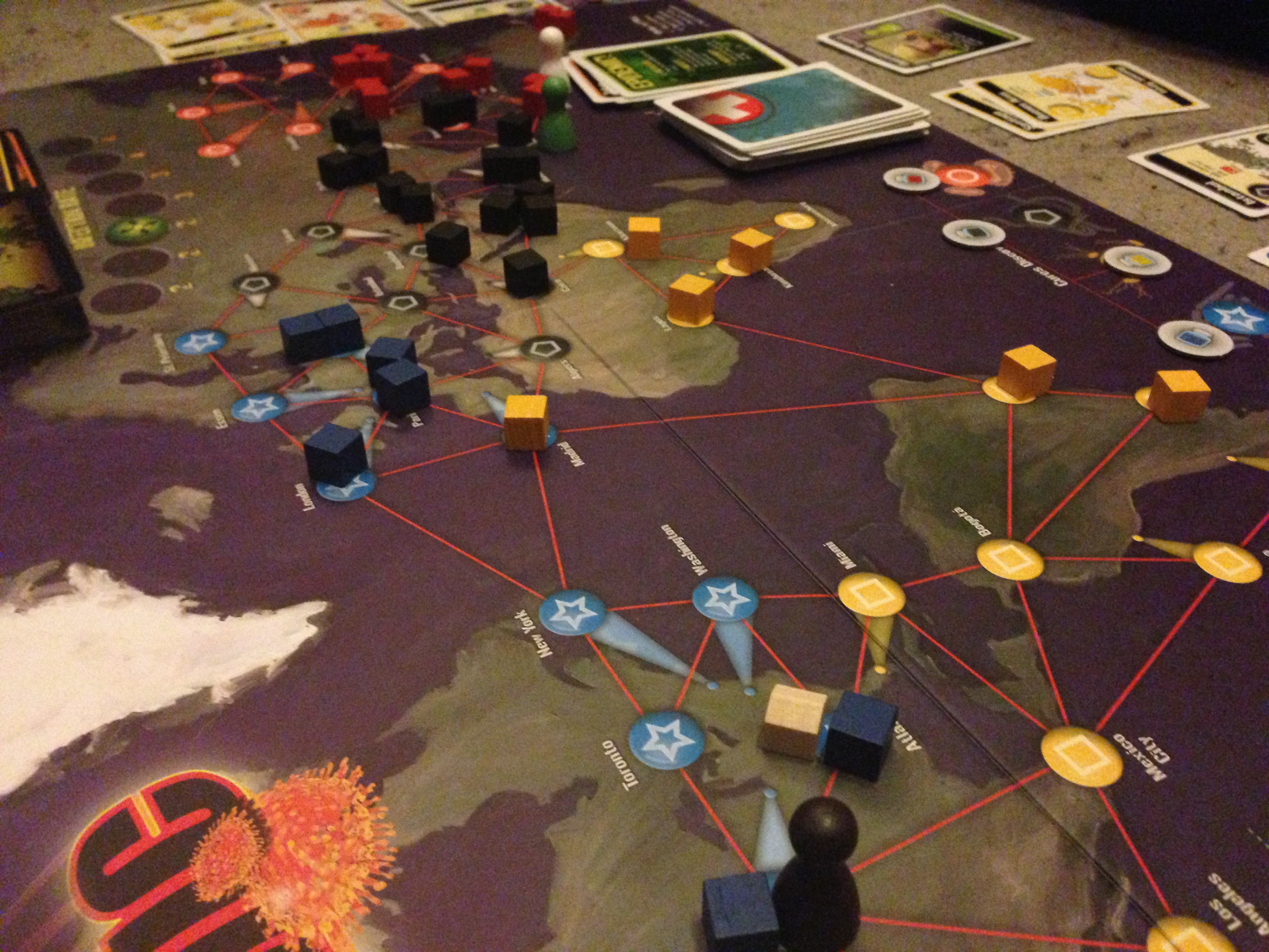 In comparison to bigger flashier games such as Descent there’s not much to Pandemic in regards to content. Despite this the quality of pieces are great; our board has survived many breakthroughs without rips and the cards haven’t even begun to bend yet.
