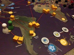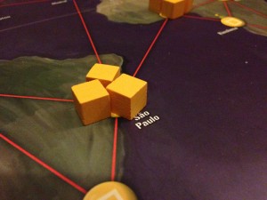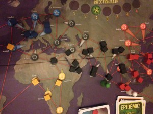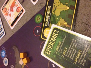 Setup: Fi drew the Medic which she always enjoys playing. I drew the Scientist which means I need only four coloured cards instead of five to create a cure. Ellise drew the Dispatcher. Her job is to make sure everyone is where they need to be. We’re all ready to go and the starting board is relatively clear though there is a potential chain reaction between Sao Paulo and Lagos.