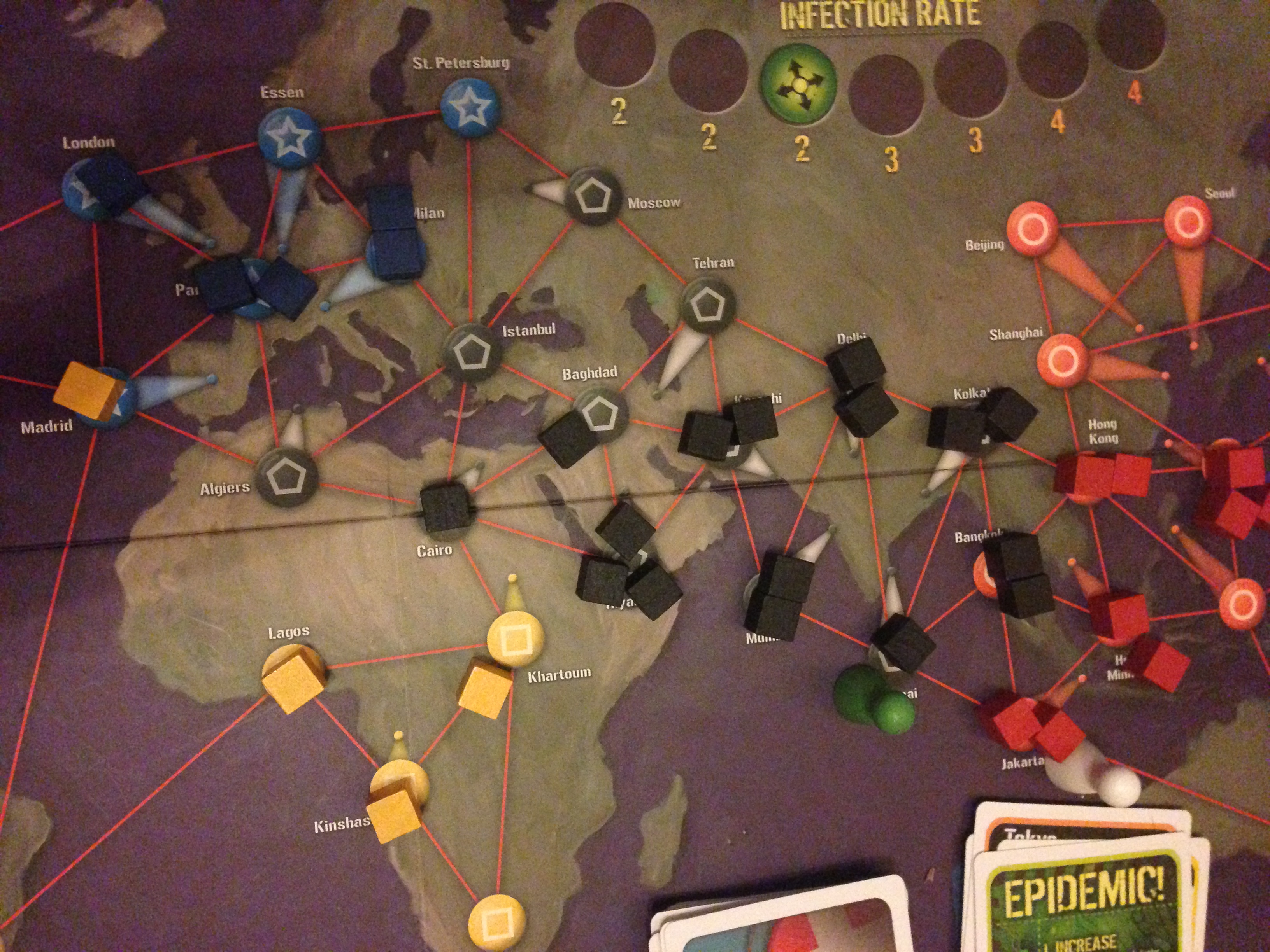 Round 3: This is where it all went wrong. I started by purchasing the Yellow cure. Great news right? Too little too late. The next card I drew was an epidemic forcing an outbreak in Sao Paulo, which turned into a three-outbreak mega chain. Disease cubes everywhere. Thankfully as the medic, Fi can can remove all disease from a city just by moving through it once a cure has been found. With five outbreaks left until end-game, she zipped through northern Africa and cleaned up the majority of the mess. Ellise, now on the outskirts of Asia, spent her actions removing blocks from cities that were close to an outbreak.
