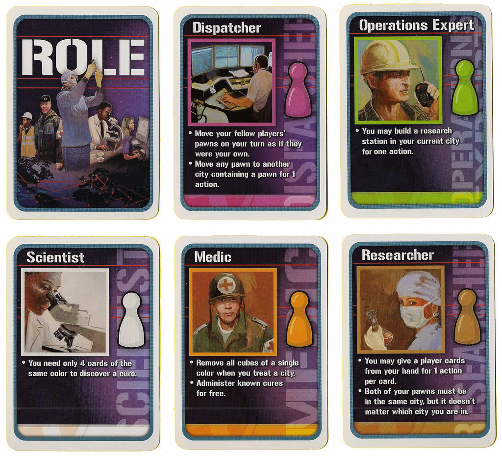 Pandemic is a co-operative board game for 2-4 players. The players take on the role of a special team tasked with stemming and ultimately curing diseases spreading across a world map. Each player is randomly dealt a specific role and each role has unique abilities. The Medic for instance can heal cities and administer cures faster than other roles and the Dispatcher can move himself and other players around the map faster than others.
