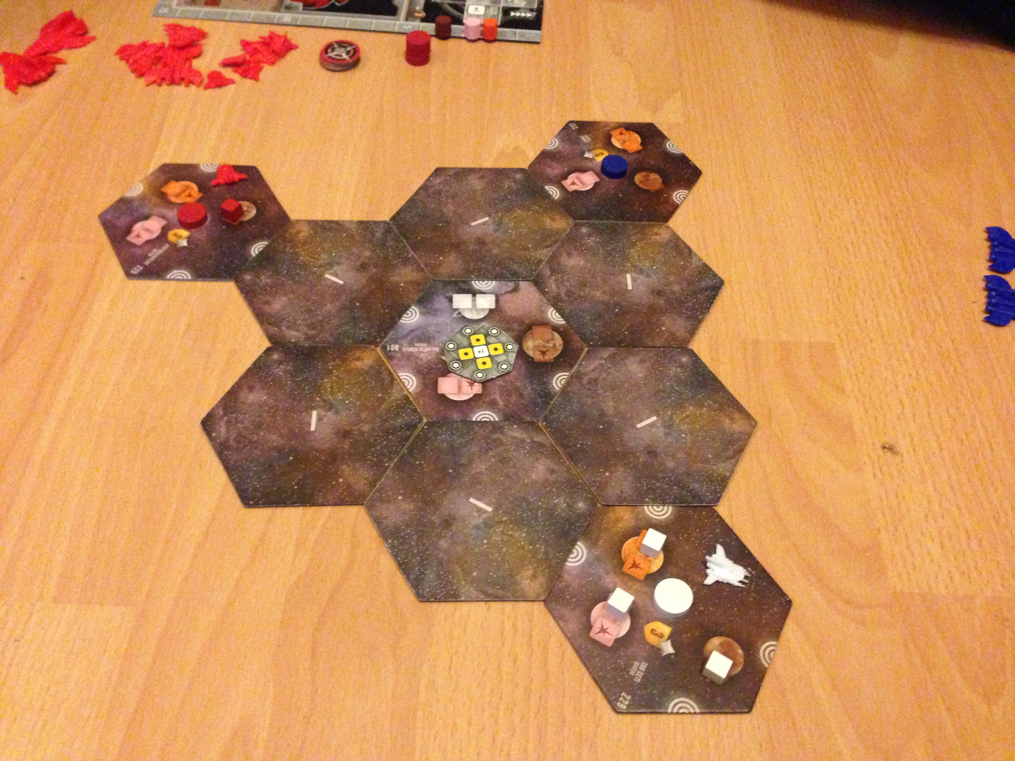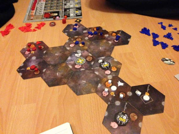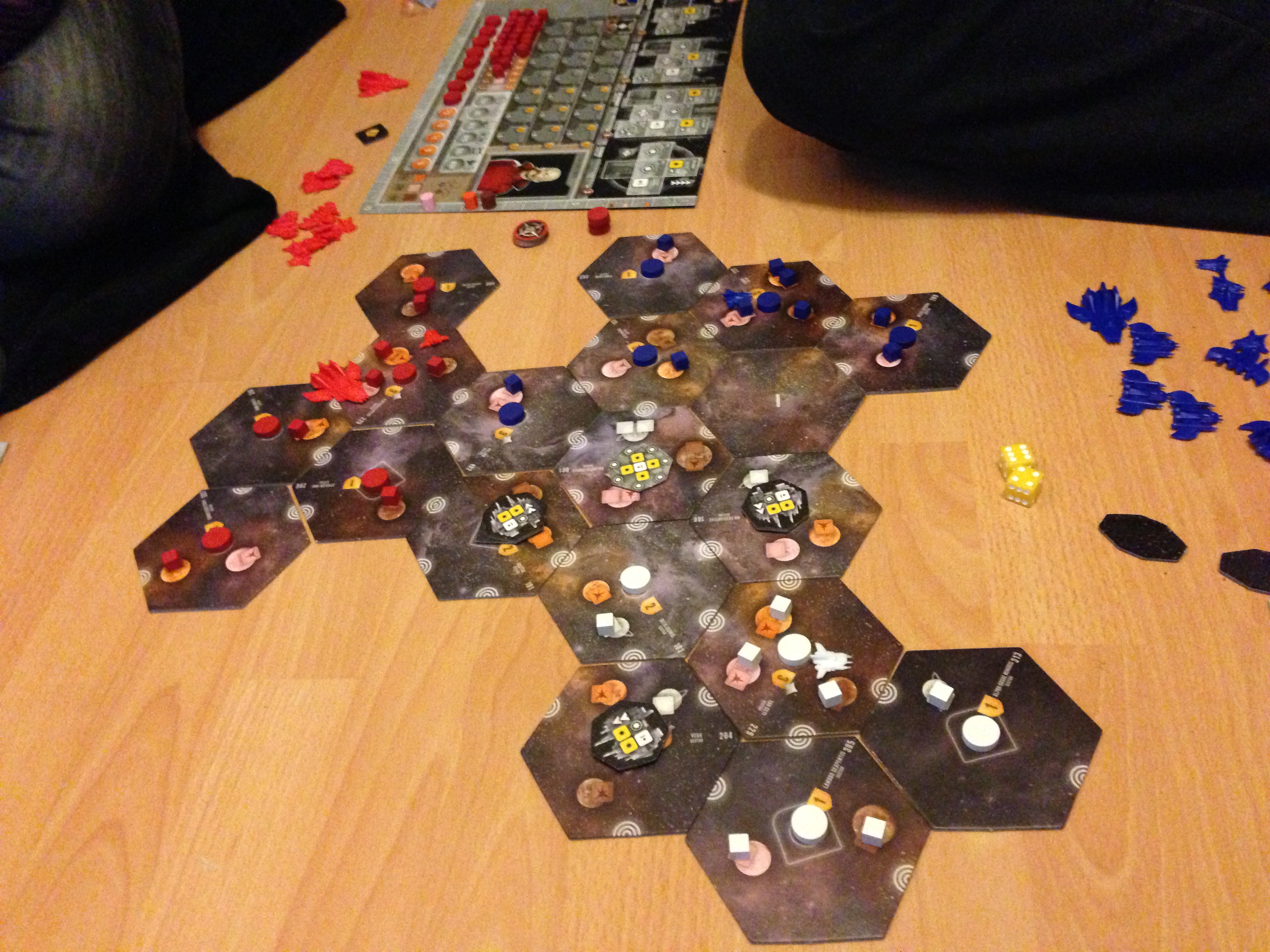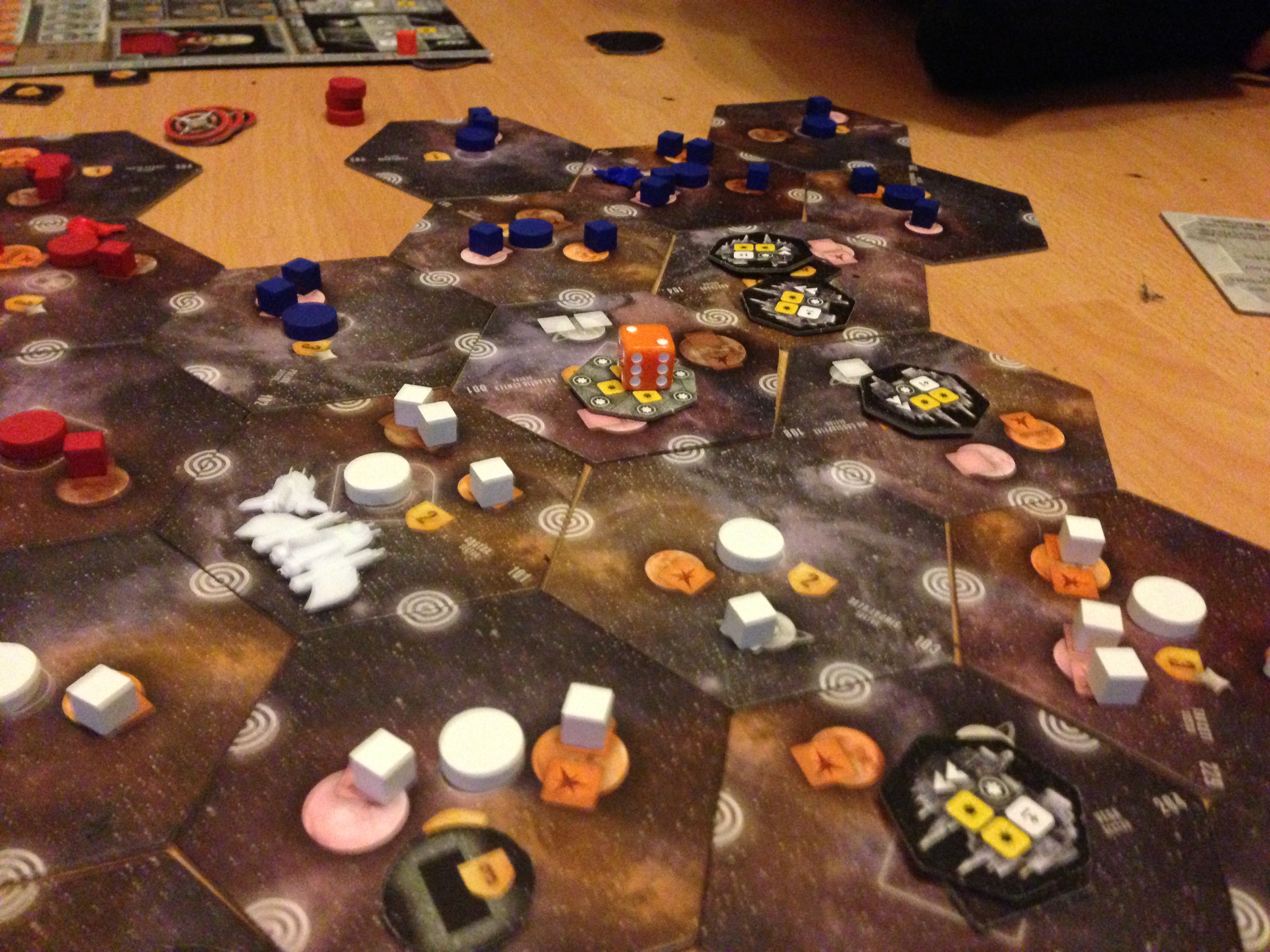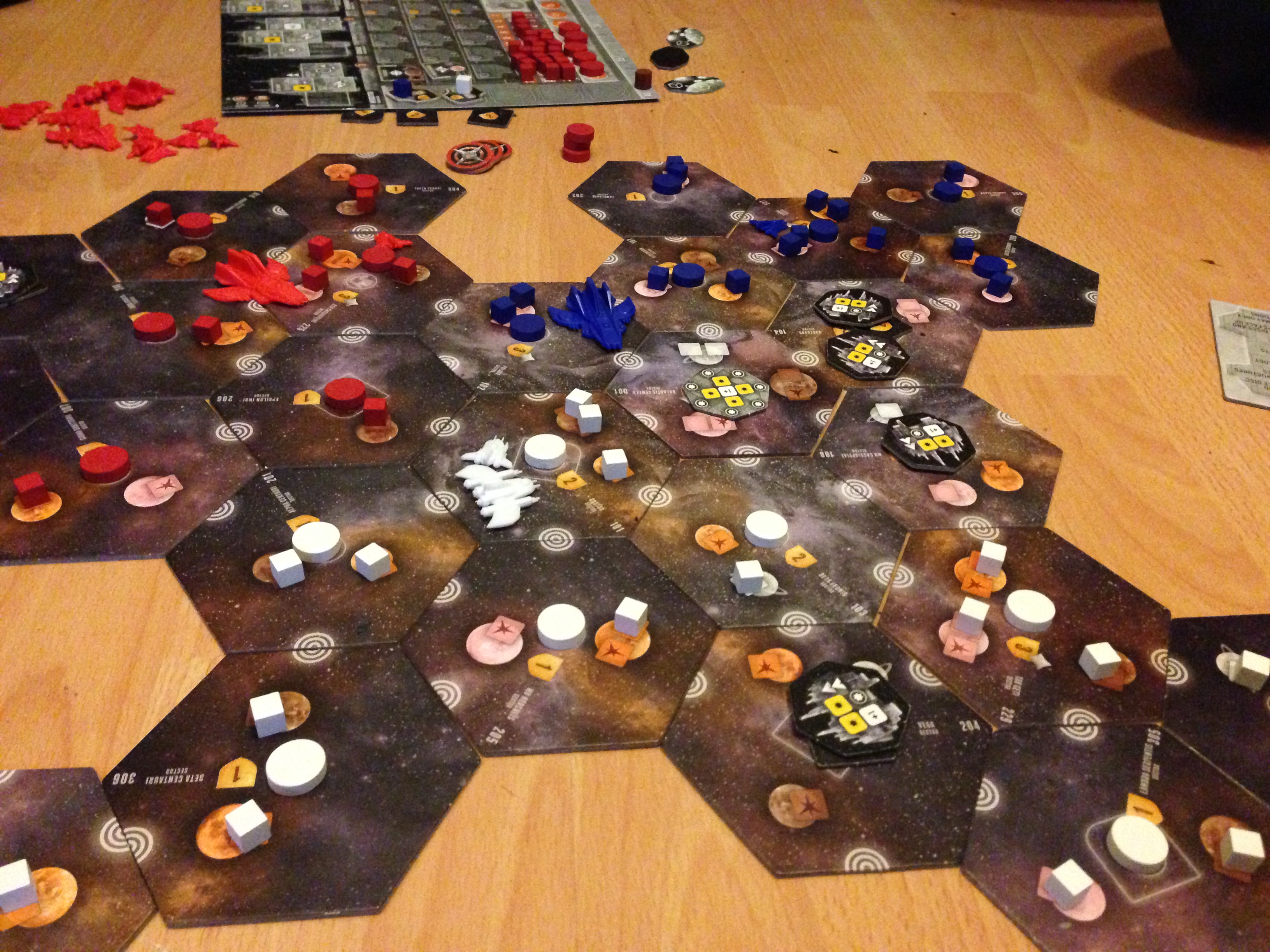 The midpoint status quo: From here, each of our actions is more important than before. We’ve had enough space to work around each other so far but if we wish to avoid exploring deeper (and more dangerous) space we’ll start treading on each other’s toes. The threat of the various ships starting to appear on the board is enough to make most of us think twice about invading and stealing opposing sectors. The amount of sectors we’ve claimed is also starting to take a toll, limiting the number of actions we can afford each turn to balance out resources. Right now anything could happen, with no one player taking a clear path of action.