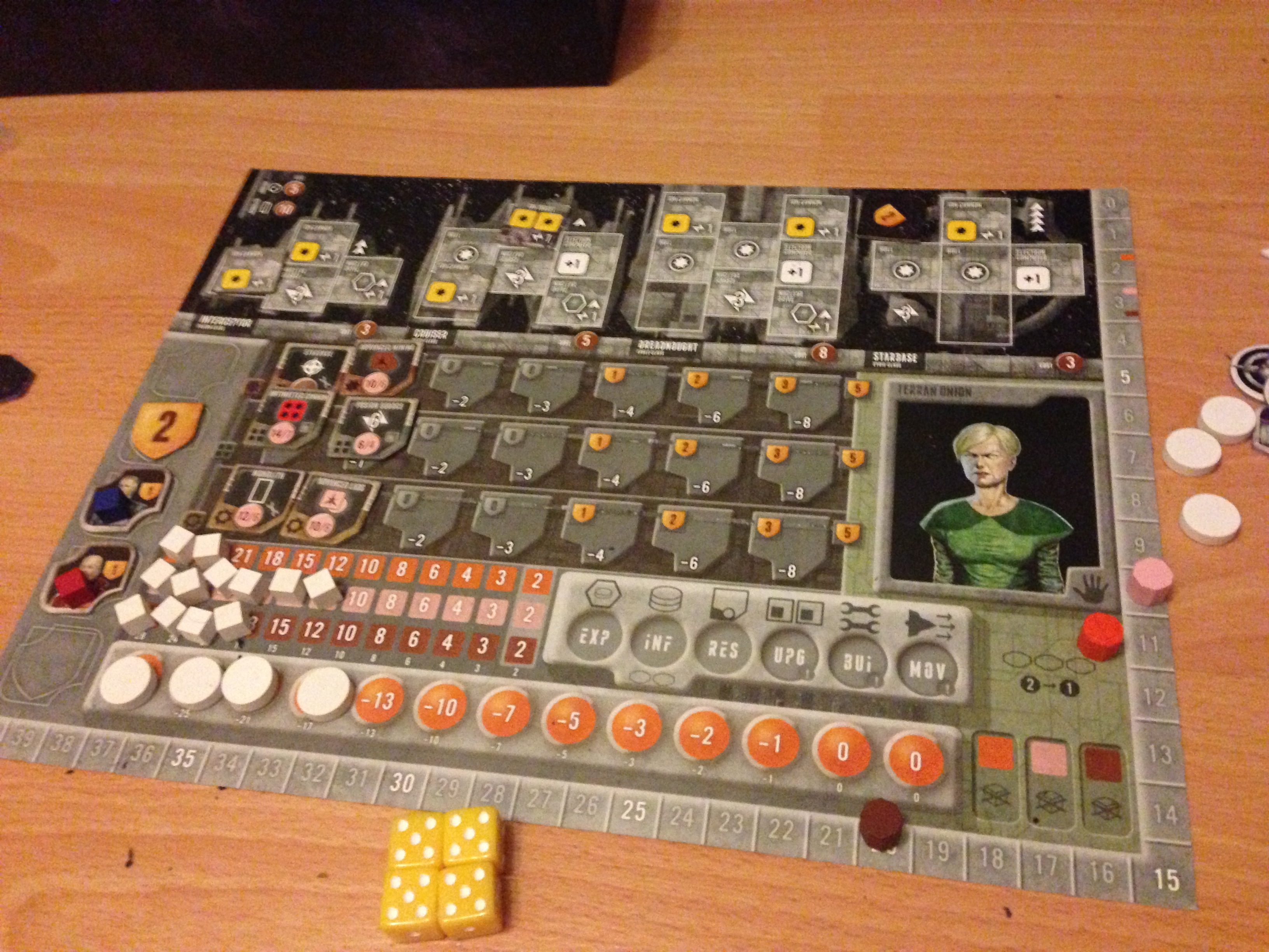 My own player card coming into Round 7. The Brown marker represents Materials, Pink Science and Orange Money. On the left we have ambassadors from Fi and Josh’s factions.