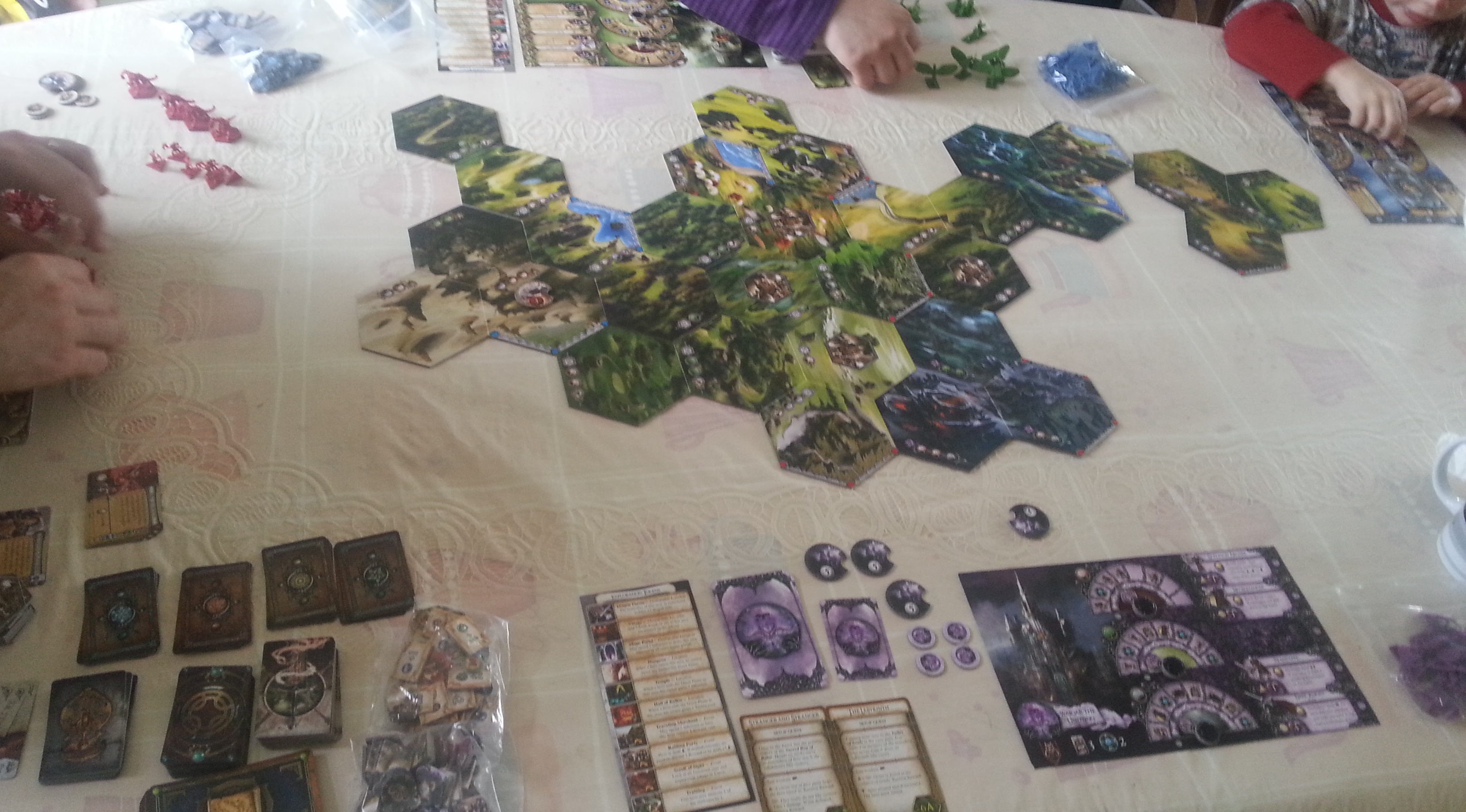 - Lastly season, fate and reward cards are shuffled and placed near the board with a mountain of various tokens alongside it.