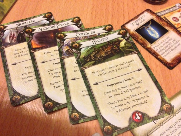 The second year of the war was long. For the most part myself and Fi spent it bolstering our positions, recruiting new troops and securing new lands. We both took the chance during summer to exchange our shards for new rune tokens on the board. During the autumn a small band of elves pushed deeper into the west and after a victorious fight against the same group of Razorwings that had fled beforehand, the elves were annoyingly close to my line of defence. Fi won the influence bid that was drawn at the start of winter as I wasn’t prepared to spend the single influence I had left, netting herself a card from the reward deck and drawing yet another Timmoran shard. Other than the mass of dragon runes on the board, all was quiet in Terrinoth in the second year of the war.