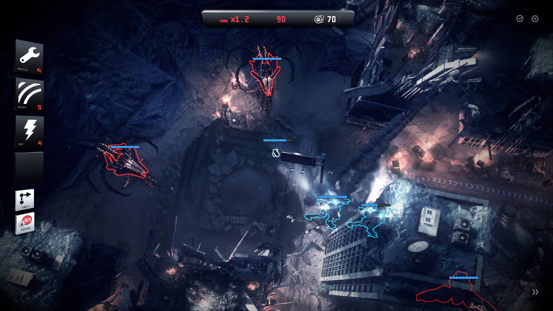 In addition to the repair fields you get a targeting indicator to ensure your men aim at the necessary turrets of a cluster, a distracter field which pull the turrets away from your chaps until it’s destroyed, and a very localised field that turns turrets off until they’re fired at, and all these field generators drop from dead turrets, so have to be collected. This, along with the equivalent of Jamiroquai’s garage with a vehicle for every occasion, are the tools you use to work your way through the storyline version of single player.