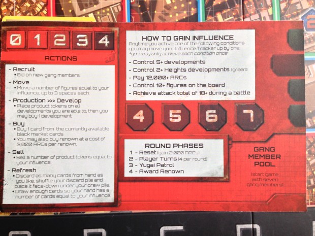 It isn’t without its problems though, as it suffers from what I like to call FFG syndrome. Named after the premier boardgame publisher Fantasy Flight Games, FFG syndrome is more of a side-effect than a problem. Like Fantasy Flight’s games, City of Remnants has a ton going on for new players to get used to. Turn orders, influence, developments, product, gang members and the black market to name but a few each with their own rule system and complexities to remember. Luckily, Plaid Hat Games have released a handy tutorial making the whole process simpler.