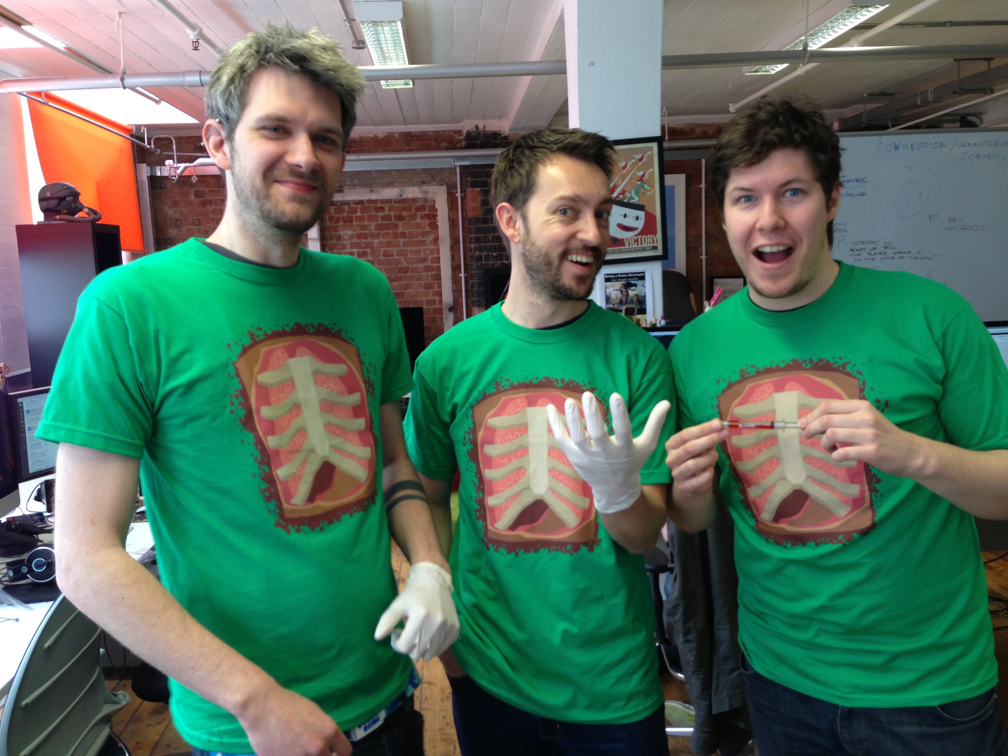 Surgeon Sim T-shirts modelled by developers Tom Jackson, James Broadley and Luke Williams of Bossa Studios