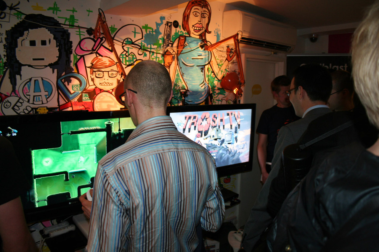 And for the final time, until next year hopefully, we come to the Exhibitor of the Day award which today, due to the extreme amount of swag talent on show is SHARED (hold your casino online gasps of disbelief/groans of unoriginality please). Today’s winners are all of us, the attendees! But seriously, it’s Trash TV and Pixel Escape. The first, developed by Lawrence Russell, found its fame after picking up a nomination for Intel’s Level Up award in 2011. Trash TV is a platformer based around puzzles with a dark and industrial feel – similar to a techno-themed Limbo with a VHS aesthetic. The second, Pixel Escape from two-man team Eugene and Jonny from Leeds, is what I can only describe as Lemmings and Linerider crossed with Bit.trip Runner. That overly-specific analogy comes from the fact your little teams of pixelmen are constantly on a crash course with whatever is in front of them with only a jump and a magical pen tool to help you avoid it. The pen tool helps you create bridges and ramps, or saves you from ill-timed jumps with spiky landings. A playable browser-based version should be available soon in order to secure sponsorship for steam and iOS/Android versions to follow. Both games well-deserving of their top spots from today’s offering and should see the light of day in the next couple of months.