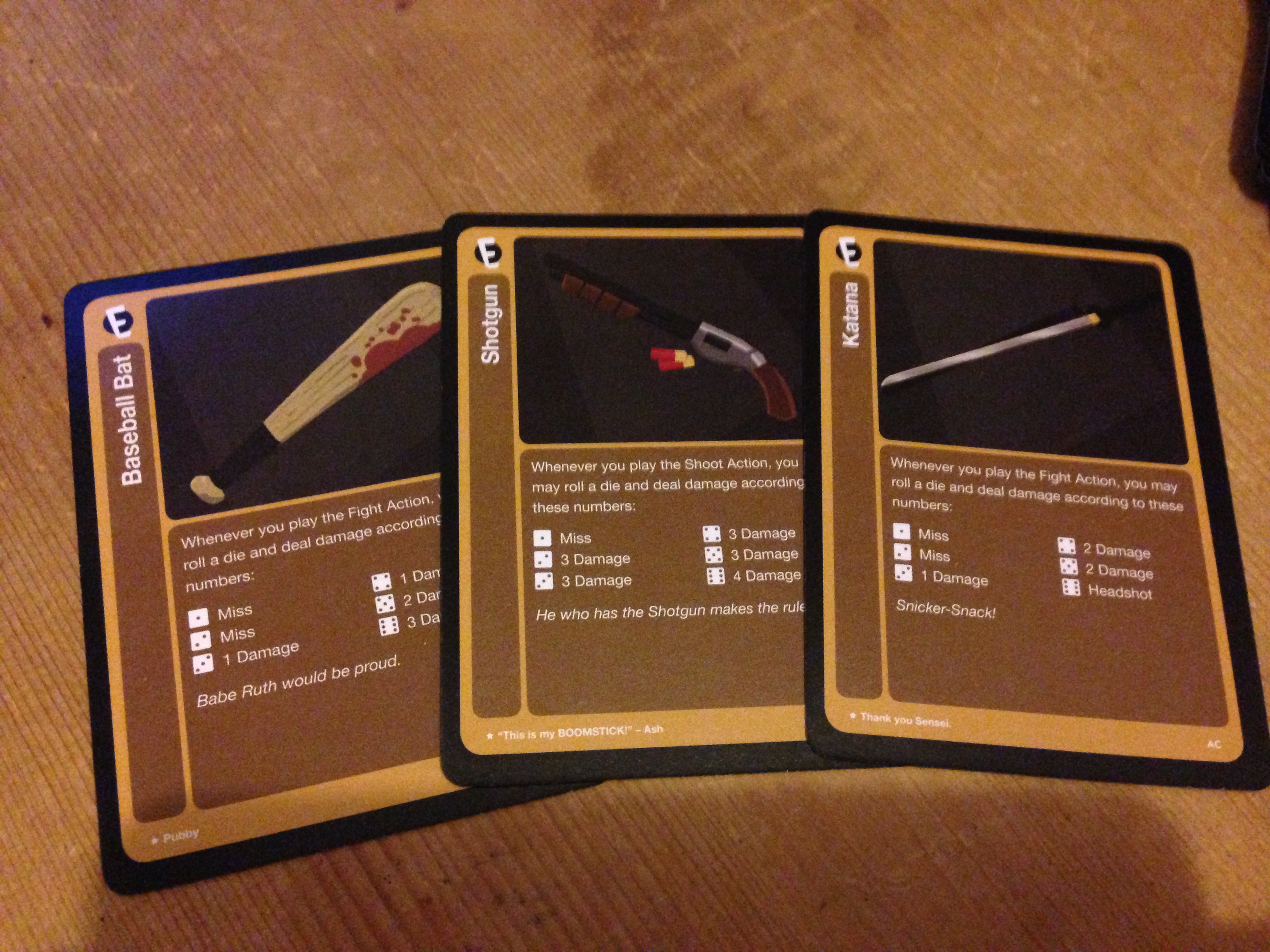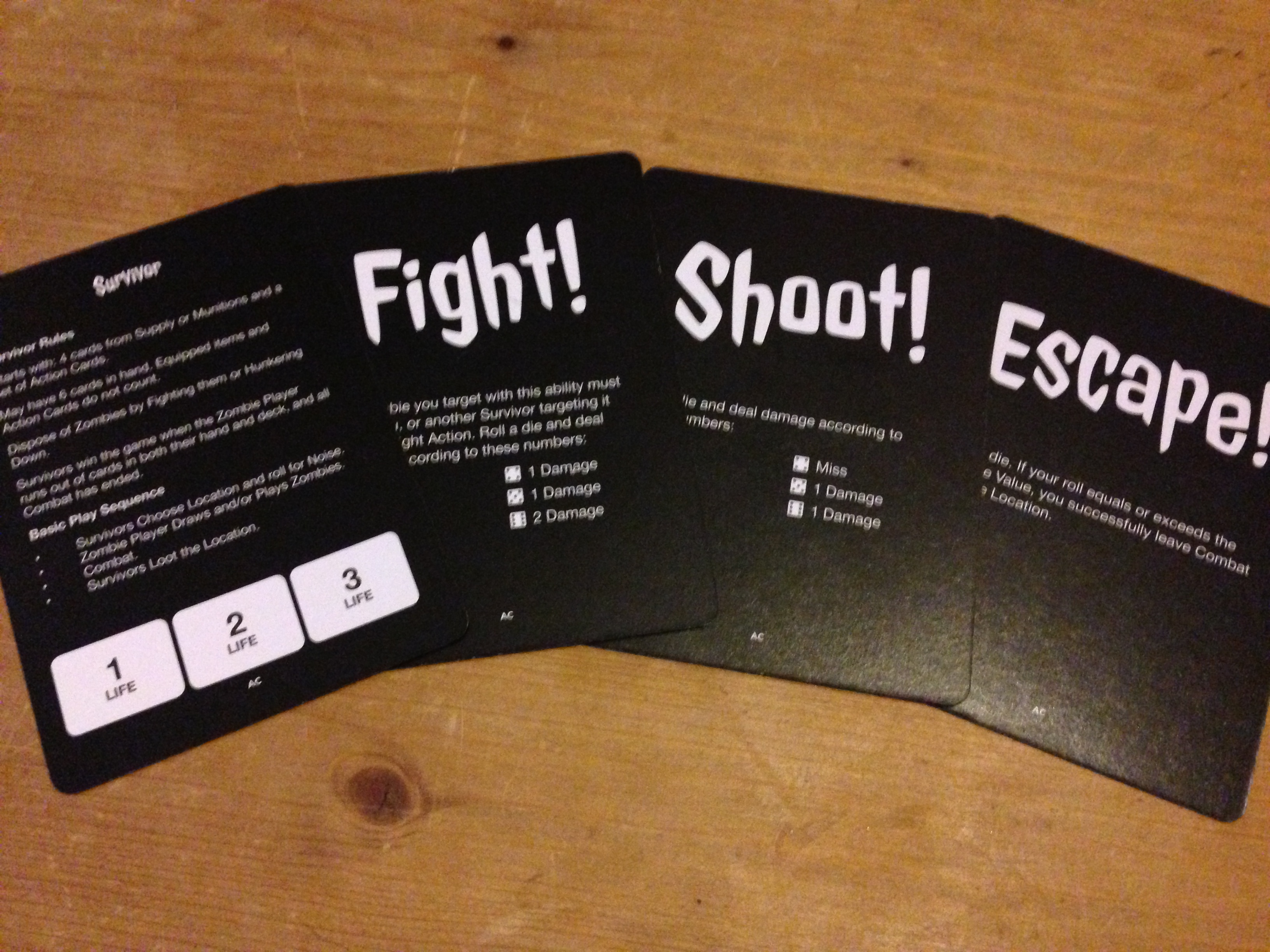 - Weapons: Each survivor gets three action cards to use during combat with a zombie: escape, shoot and fight. Shoot and fight cards require the survivor to have a weapon of the relevant type to use, else they revert to base stats for minimal damage. Weapons are found in the munitions deck and range from katanas to revolvers, each with its own stats and power. Attacks are resolved by rolling a die and matching it with the result on the weapons card. Headshots (almost) always kill a zombie instantly.