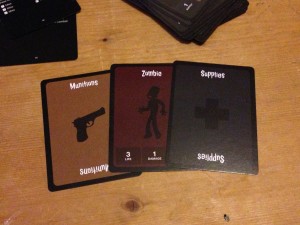 During the zombie phase the zombie player can play a zombie from its hand for the survivors to fight. Combat proceeds in rounds with zombies dealing damage to survivors after each round of combat. Damage dealt by weapons and abilities are deducted from the zombie’s life total until it reaches zero and it dies. Once all zombies on a location have been defeated, the remaining survivors may loot that location drawing x number of cards from the munitions and supply decks as stated on the location.