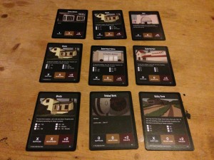 - Location: Location cards are shuffled at the beginning of the game and nine cards are randomly drawn then placed in a 3×3 grid in the middle of the table. Each location has its own name, a bonus for searching it (upon defeating a zombie inside) and an escape value to be used when running from zombies. Locations can only be searched once.