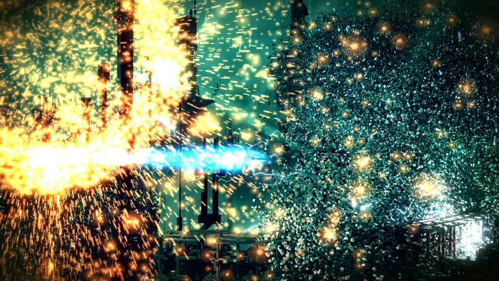 When you speed boost into a group of enemies killing every one of them in a huge explosion it’s simply breathtaking. But the best is yet to come. You ship is armed with the overdrive weapon that is so over-the-top in its power. You charge by killing enemies and collecting their green energy cubes before you can unleash it by holding down R1. Once fired, time slows down and the screen becomes filled with devastating lightning bolts, explosions and showers upon showers of voxels from the legions of enemies that perish. I’ll admit, on more than one occasion, I’ve actually cackled with laughter while firing it.