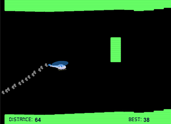 The idea of moving to the right and being very specific about your placement in the level isn’t new. It follows on from a much older game called Helicopter, which also sees you travel to the right and fit through spaces but the input is almost the reverse. In Helicopter it’s too difficult to regain your altitude and your input creates such a minor change in your climb without being sustained. In Flappy Bird you climb too immediately and have to be far more precise about your action.