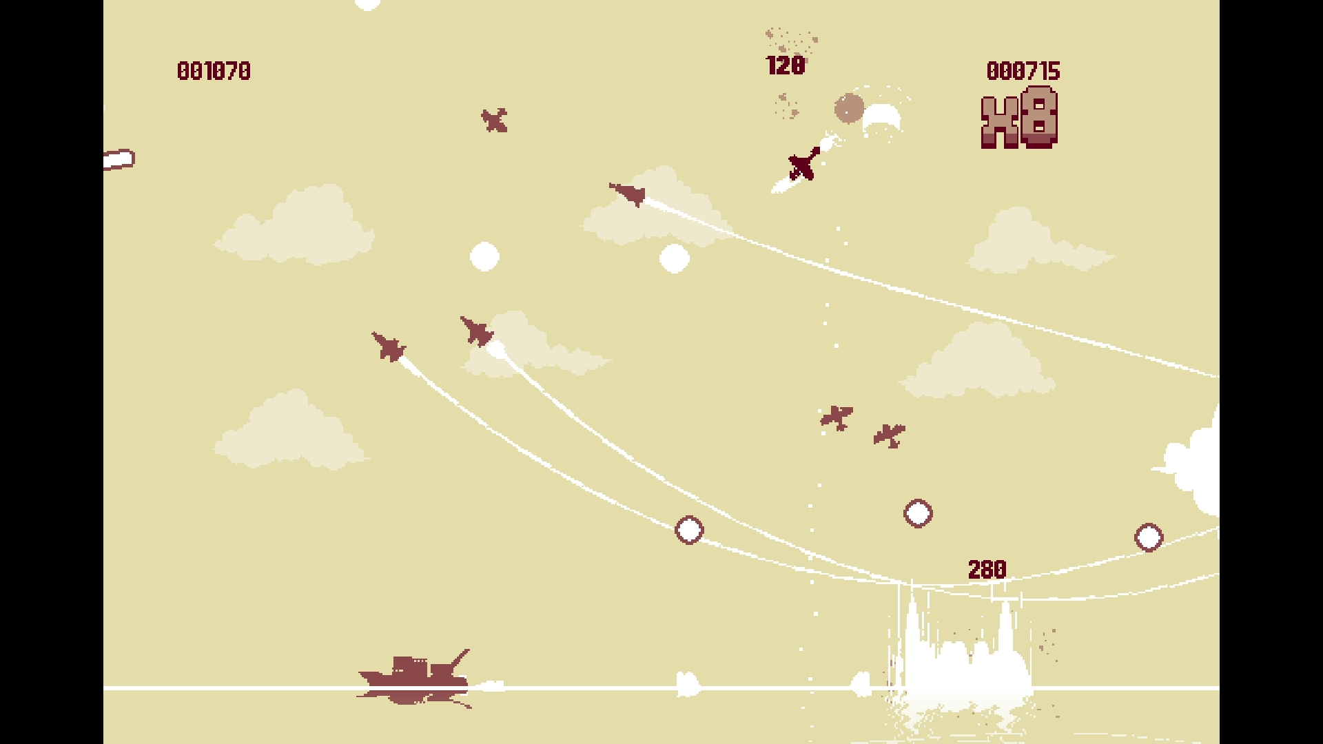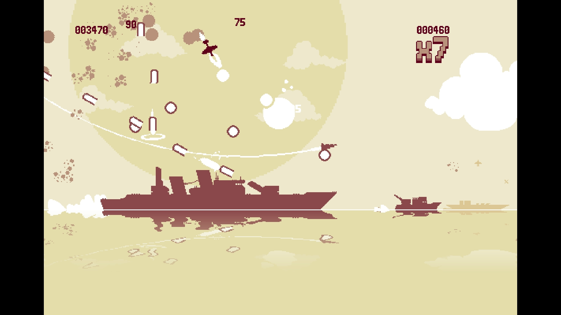 Constant death is inevitable in Luftrausers, but this is glorious, unpredictable, addictive and even productive death. Every plane or battleship you destroy tops up your overall score, levels you up, and bumps your multiplier within each run too. Levelling up means better weapons, armour and the like, and thus, this is how you progress in Luftrausers. In-game side objectives, such as destroying 6 planes in a single, run unlock further parts and modifications; homing missiles, reduced melee damage, even protection from water. You’ll need that last one should you dive in for temporary cover and all bring variety to the feel and power of your craft. You toughen up, the opposition gets tougher, and more frequent, which serves up more breathtaking moments of near-kamikaze brilliance.