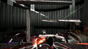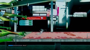 From the fan-service panty-flashes to the tediously unchallenging levels, there’s little to enjoy about the game. Starting out as a side-scroller, you’ll run schoolgirl-cum-assassin Ranko Tsukigime from left to right, occasionally pressing the square button to hit an enemy with her violin bow. Time it right and you’ll set off a chain reaction that obliterates all the other enemies nearby, spewing sprites all over the screen in a confetti shower of Art. There’s the occasional challenge to slide through a gap or jump over one to find a new pathway that might let you top your high score for the level but since there are no leaderboards, this seems rather a feeble undertaking.