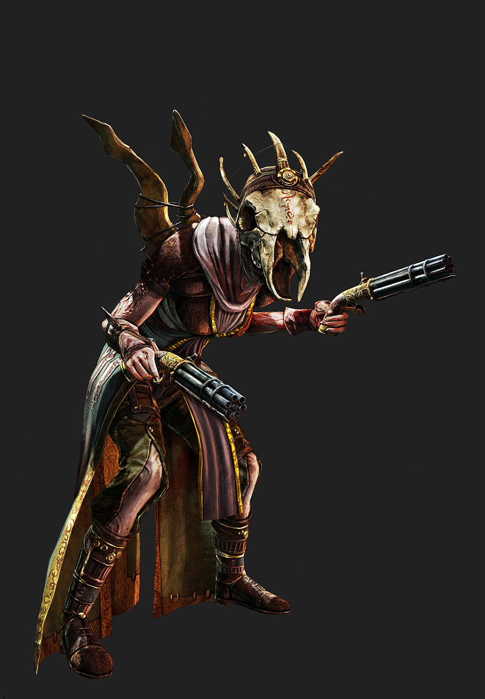 The humans will also be getting a fourth character, the prophet. According to the lore, the prophet is a mad priestess who drink from the blood fountains to maintain her powers. She carries a pair of powerful revolvers and focuses on helping her team-mates. “She’s a witch, said Beacham. “She’s a user of dark, horrible sacrificial blood magic. She’s got these twin multiple-barrelled primitive flintlocks. We always had this idea of a class that was a bit – she’s a buff/debuff class. that’s the role she plays. She helps her team-mates. She screws with the enemies by curses and hexes and shooting.