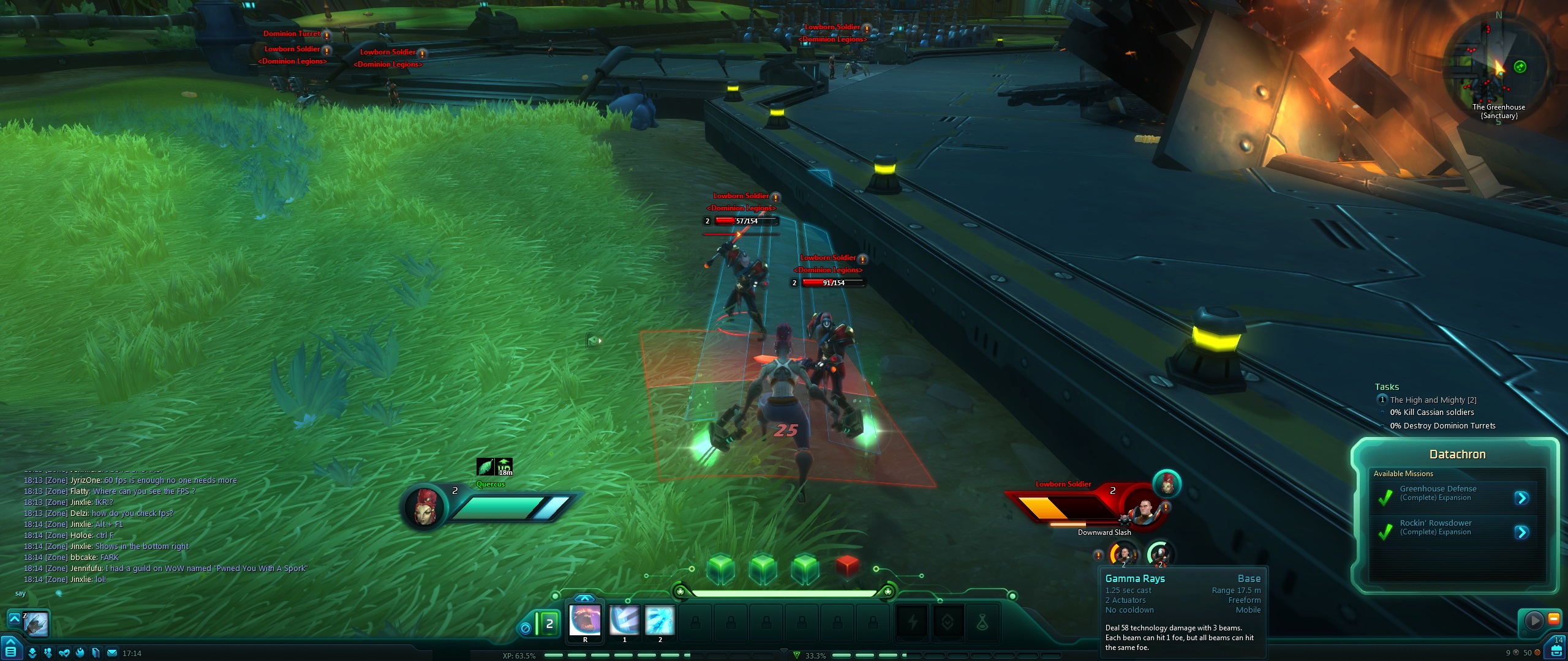 Much fiddling later *cough*, I went with an Amazonian-thighed tree woman. She’s also a Medic and a Settler, please note: she looks awesome and she’s wearing sensible clothes. Quercus (it’s Latin for Oak) is part of the plucky, probably rebel forces, trying to do good and have a nice sit down with tea and biscuits. I don’t know, I’m crap with back story but the opposing side is called Dominion and they sound much more filthy. It was a gentle first date, the game led Quercus and I around, introducing us to how quests work (like they always do), how kit management works (like it always does), and how combat works (trust me, you’ve got this). I was clumsy at first, awkward with which buttons to press, but I would have made Judy Blume proud as within no time I was dodging, healing and generally not getting myself dead.