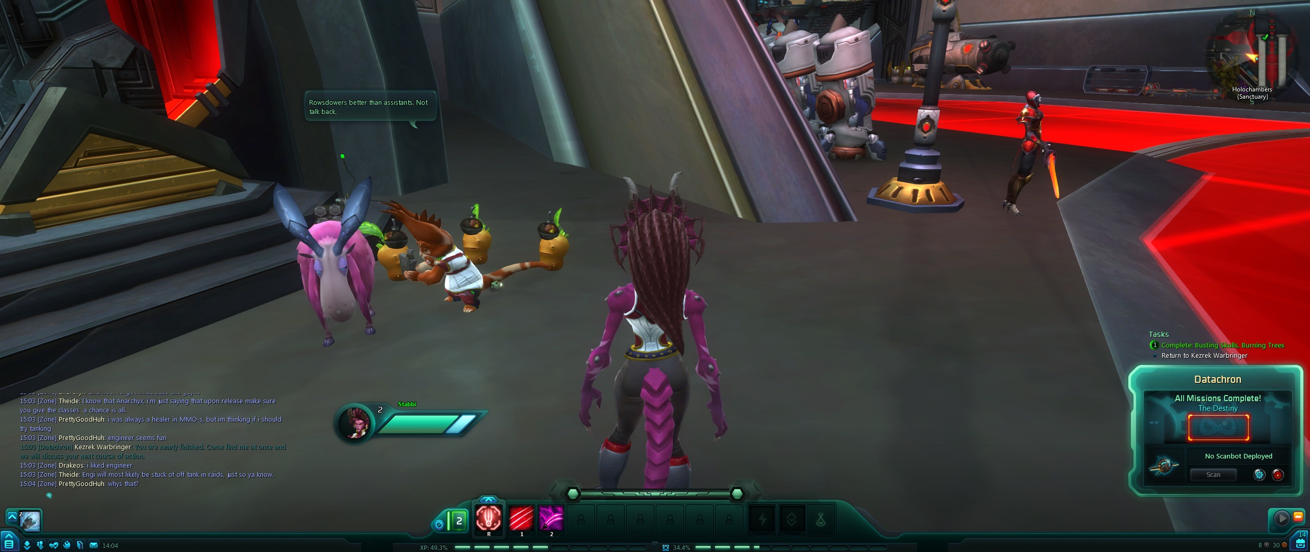 When we weren’t doing battle – and I can probably stop abusing this ‘dating’ analogy now – there was ample opportunity to survey the landscapes and listen to the environmental and NPC chatter, on all these scores WildStar performs incredibly well – there’s enough quips, one liners and unexpected moments to keep anyone smiling through what is essentially, something we’ve all seen before. Professions have a slightly new twist where I found myself running around picking up randomly spawned clutter just to make a fruit bowl for all the other players (Settler), or scanning random foliage for who knows what reason (Scientist).
