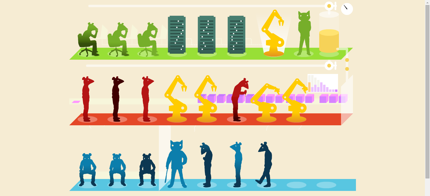 The first ending I got was the one where the unemployed masses start tearing apart the factory. And I thought that was basically the message of the piece. I thought the game portrayed an impossible system designed to inevitably fail; a lovely allegory for the eventual collapse of capitalism as it struggles to sustain itself against the will of an tired, informed and impassioned populace. I especially liked that it ends with all the mice dancing hand in hand while all the robots do the work.