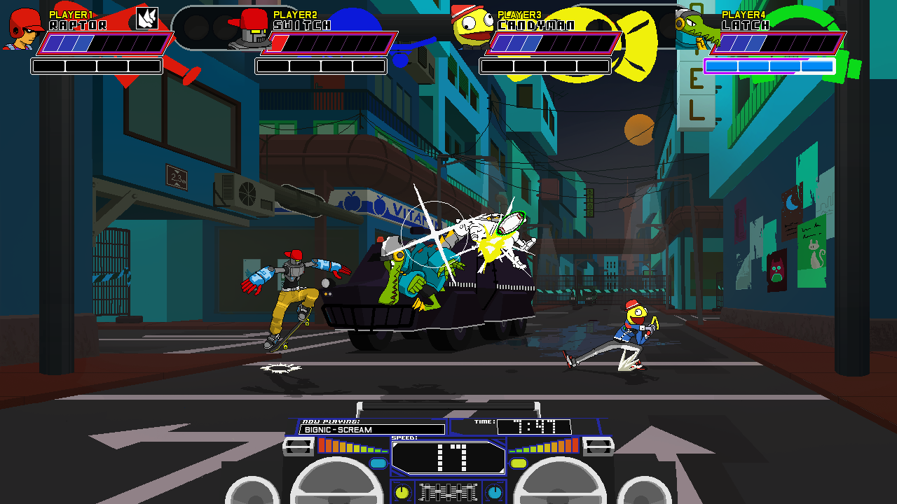 A Lethal League match is an attempt to hit a baseball at another player. When struck, a ball moves around the field like the one in Breakout or like the screensaver of an old DVD player. Hitting the ball again will increase the momentum until it’s moving so fast it’s nearly impossible to keep tabs on the fucker. If you can hit it at that of speed then your character pauses for impact, the background flashes a different colour and begins to strain itself against the focused power being exerted in this fine point. It feels fuckin’ good, it’s like you’re pushing against a brick wall and suddenly the entire thing breaks apart.