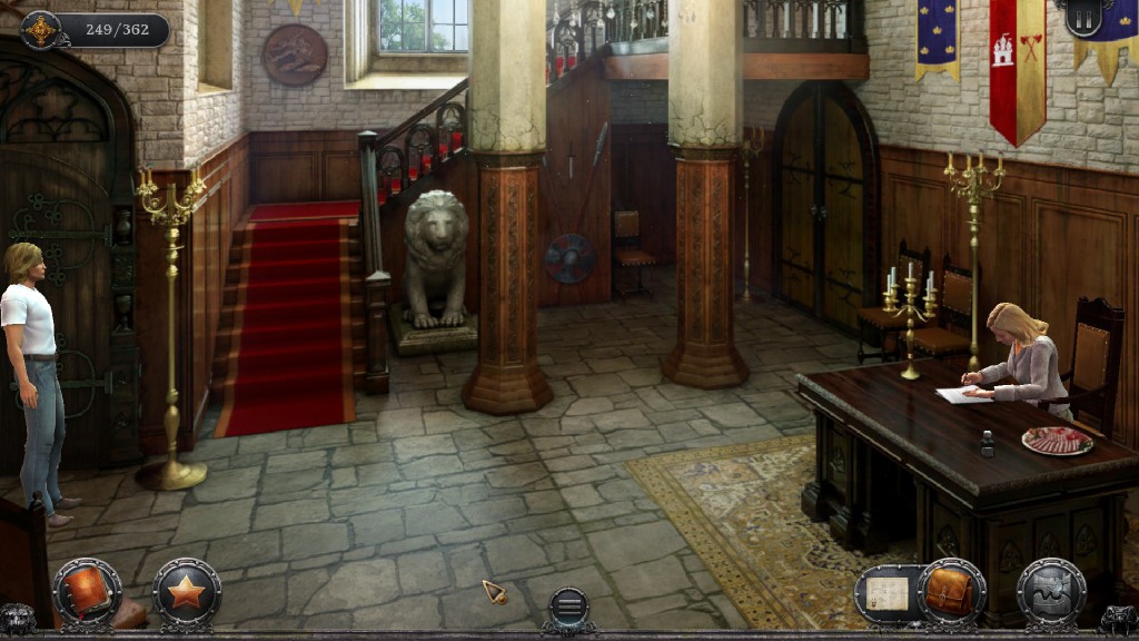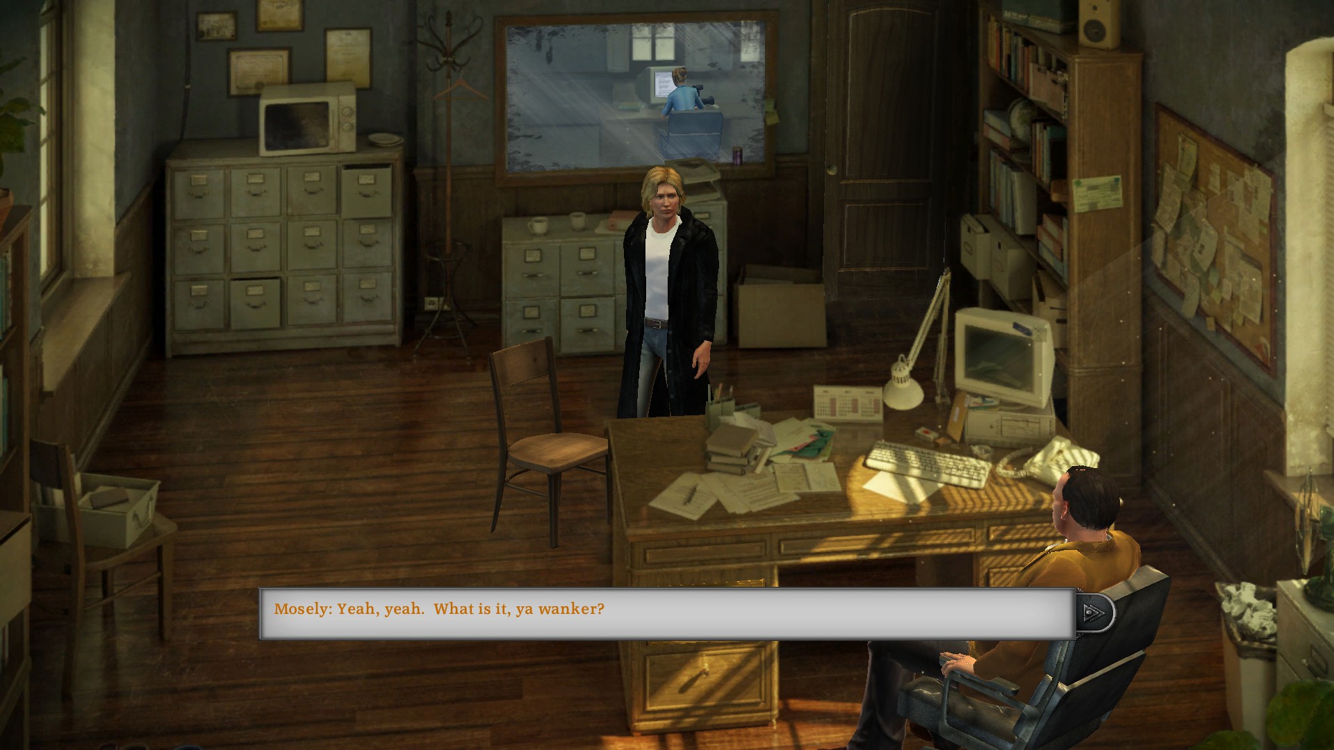 There’s not a lot to be said when it comes to gameplay for a Point & Click. There’s both pointing and clicking. Sometimes the pointing can be a bit obtuse but two very helpful tools are included: one to show up every interactive object on a game screen and the other to provide much needed pointers. Animation-wise, it’s dated obviously (even with the HD), but there’s something reassuring about watching characters moon walk across a screen towards an overly obvious Clue™.