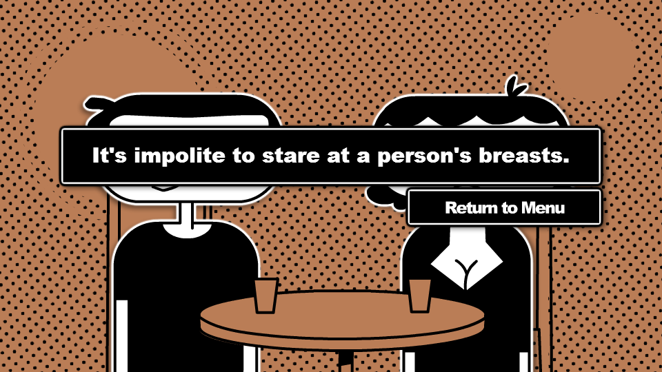 The game has you control the eyes of a dude using your mouse pointer. You pick a scenario that a regular human might face on a day to day basis and solve it by moving your pupils around. A few opening situations are just basic primers of the mechanics. Look at people when they’re talking to you, but then also don’t be too intense. Probably don’t stare at their genitals either.